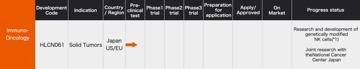 We are promoting research and development for a next generation cancer immunotherapy using allogeneic, iPSC derived NK (Natural killer) cells(*1) that have had specific functions reinforced using gene editing technology in order to target solid tumors.