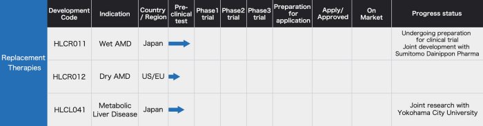 Under an exclusive license from RIKEN, we are developing a new treatment for age-related macular degeneration by transplanting iPSC-derived retinal pigment epithelial (RPE) cells. The joint development partner in Japan is Dainippon Sumitomo Pharma Co., Ltd.. Please refer to the page “About Age-Related Macular Degeneration (AMD)”.