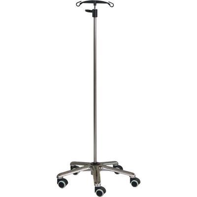 IV pole with two hangers made of nylon, with load capacity per hanger: 2 Kg. Height adjustable support from 1000 to 1950 mm; by manual knob. Polished base with five branches