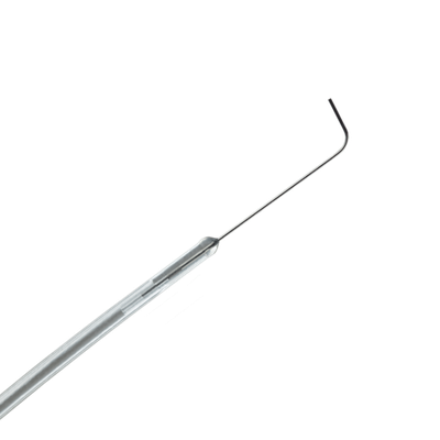 The right-angle design of the cannula tip enables an unobstructed view of the duct for placement and permits the easy movement and fixation of the connecting tube away from the area that is being radiographed.