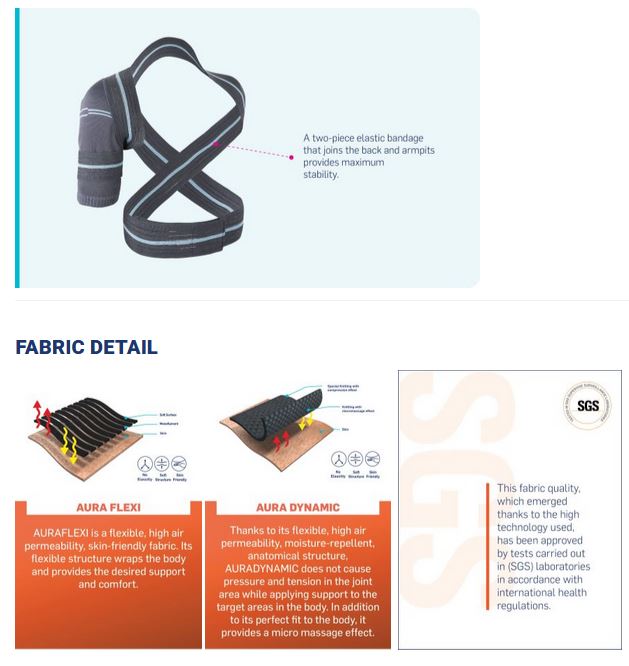 It is a shoulder support made of breathable and non-sweating fabric (Auradynamic + Auraflexi) designed according to the anatomical structure. Thanks to the knitting technique, the compression effect it applies prevents edema, reduces pain by reducing muscle tone. Elastic bandages pass behind the shoulder, go around the armpit and meet in front and provide maximum stabilization.