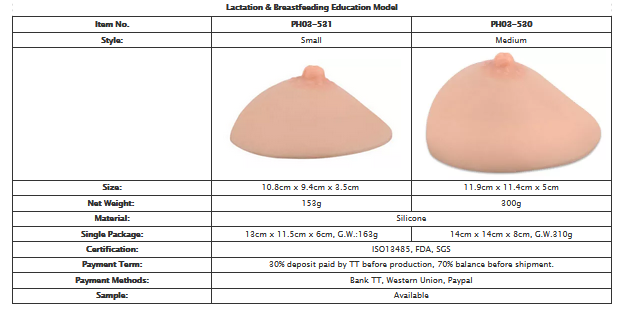 - 2 common sizes of female breast models are available, small and medium for breast demonstration or education.