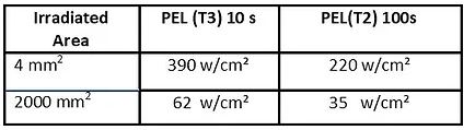 Tested in accordance with NFP92-503 (Electrical Burner Test), the material is rated as M2. When irradiated with greater than 35 w/cm² it will emit a non-hazardous smoke and may glow, thus indicating that a stray beam is present. Protection times given by the material at various power densities are shown in the specifications below.