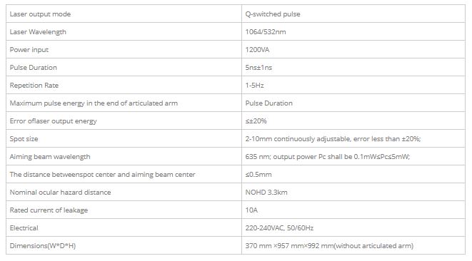 - Two Stages ND:YAG system(double rods and double xenon lamp) with higher energy output, and make the pulse width as short as 5ns. get
