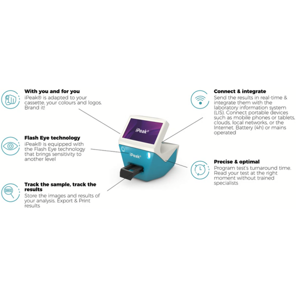 iPeak is the colorimetric rapid test reader that enhances the colors of your test. Modern design and state-of-the-art features that allow printing and export of your results for full traceability. It can also send them in real-time and integrate them to your laboratory information system (LIS) or send them to your server with one click.