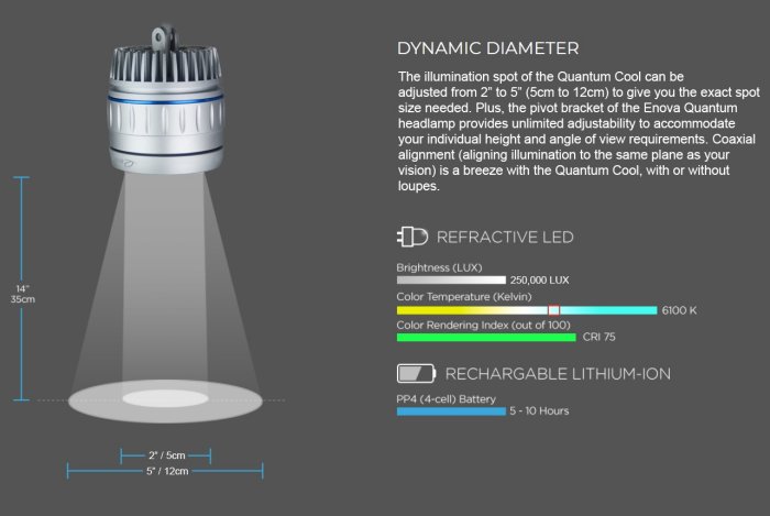 The illumination spot of the Quantum Cool (XLT-250A) LED Surgical Headlight can be adjusted from 2” to 5” (5 cm to 15 cm) to give you the exact spot size needed. Plus, the pivot bracket of the Enova Quantum Cool headlamp provides unlimited adjustability to accommodate your individual height and angle of view requirements. Coaxial alignment (aligning illumination to the same plane as your vision) is a breeze with the Quantum, with or without loupes.