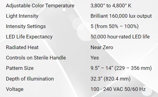 - Color temperature at your command, with five settings between 3,800° and 4,800° Kelvin to meet the surgeon’s specific needs.