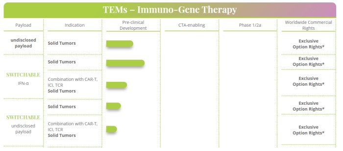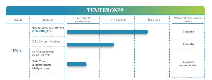 Temferon™ is a lenti-virus based hematopoietic stem progenitor cell immuno-gene therapy enabling controlled and targeted interferon-α expression within cancers. Biologically delivered via engineered tumor infiltrating monocytes (Tie2 expressing monocytes – TEMs), Temferon™ generates immune responses to any TEMs positive tumors. As such the biological readouts and safety of Temferon™ in Glioblastoma patients should support the potential development of Temferon across a broad range of solid tumors that recruit TEMs. Underlying Temferon™ is a platform technology that controls the expression of the gene within the tumor microenvironment and can be applied to multiple different payloads. As a gene therapy, the impact is enduring, creating potentially life-long tumor surveillance.