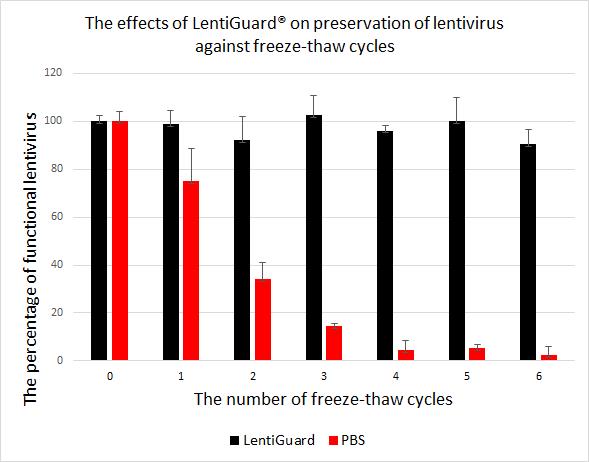 LentiGuard® is a new product developed to preserve functional lentivirus titer during freeze-thaw cycles. Lentivirus titer may drop 50% with just one freeze-thaw cycle without LentiGuard®. Adding LentiGuard® to the lentivirus supernatant or concentrated lentivirus, the functional virus titers are preserved 90% even after six freeze-thaw cycles.