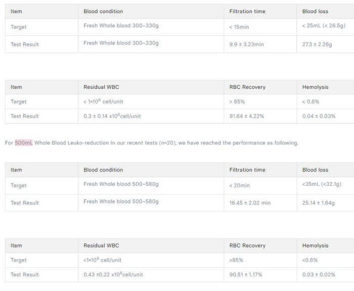 It is designed for leuko-reduced 250 or 500ml fresh whole blood.