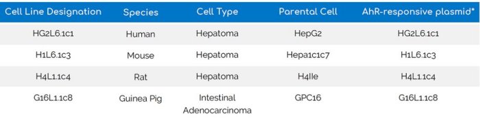 Stably transfected CALUX cell lines containing an AhR-responsive luciferase reporter gene are available for a variety of species, including human, mouse, rat and guinea pig.