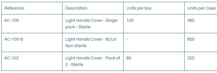Single use. Quick and simple application. Eliminates costs associated with inventory of reusable handles. Latex free. Available in single, double or triple packing. Reduces cost and storage space. Adaptors available for all O.R light systems.