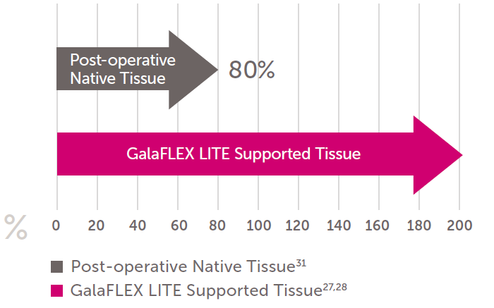 In preclinical studies, GalaFLEX LITE showed rapid tissue regeneration, resulting in a new tissue plane twice the strength of the native tissue. GalaFLEX LITE retains strength, supporting and reinforcing the surgical repair for a year.