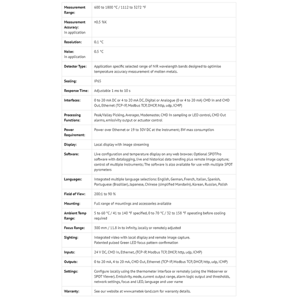 LAND® - Model SPOT+ MM - Liquid Metal and Tapping Fixed Spot Non-Contact Thermometer / Pyrometer