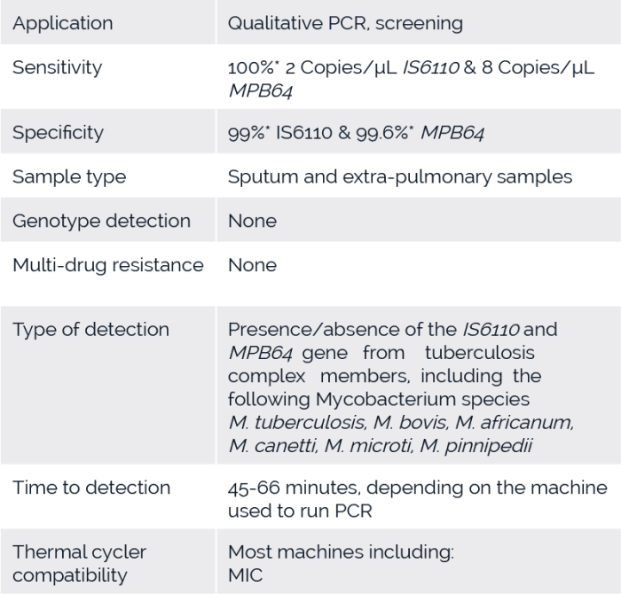 The Logix Smart MTB kit was designed and validated for use in respiratory tract fluid specimen for detection of presence or absence of Mycobacteria tuberculosis complex M. tuberculosis, M. bovis, M. africanum, M. canetti, M. microti and M. pinnipedii through amplification of the bacterial DNA markers IS6110 and MPB64.