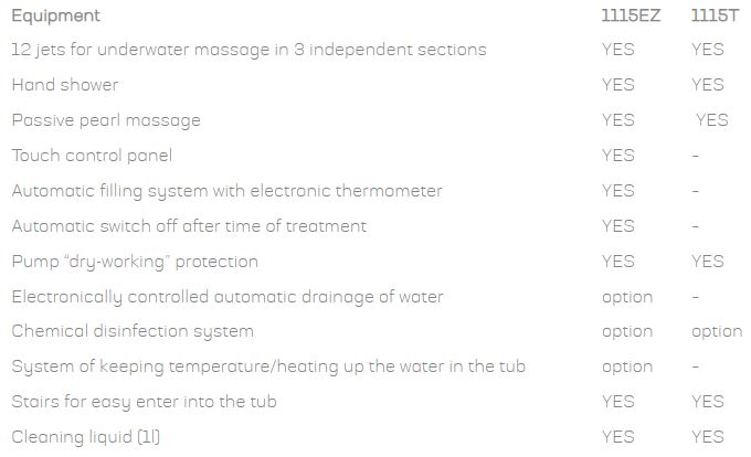 Whirlpool tubs 1115T and 1115EZ are designed for treatment of lower limbs and lumbar spine. The treatment in both models is carried out by 12 underwater jets with adjustable working direction, divided into three separate sections. Two levels of filling the bathtub provide significant water saving. Electronic panel ensure the possibility to choose between 7 possible combinations of sections operation.