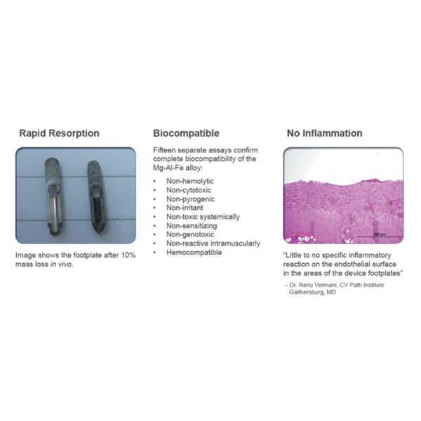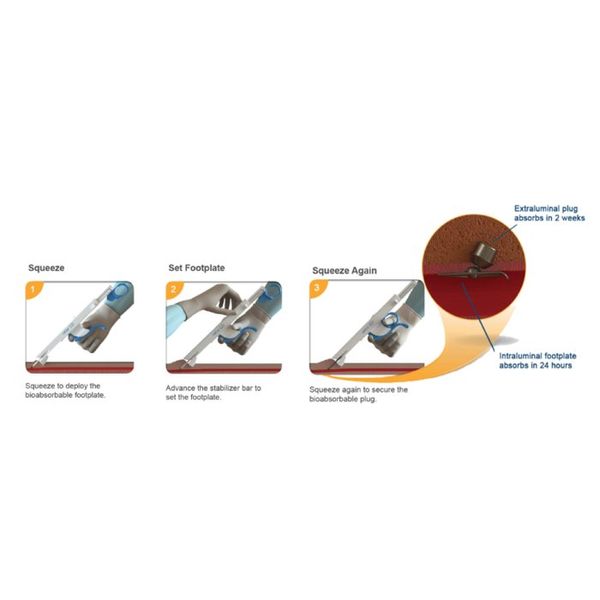 A first-of-its-kind magnesium alloy-based vascular closure device that offers a unique method of quickly achieving stable mechanical vascular closure following percutaneous catheterization for diagnostic or interventional procedures using 5-8 Fr procedural sheaths. The implant consists of a plug and footplate system that when presented to the arteriotomy, effects immediate, stable and reliable hemostasis.