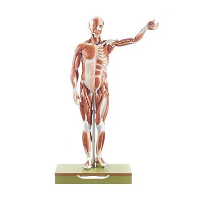 About 1/2 natural size, in SOMSO-PLAST®. Right and left arm are removable, otherwise in one piece. The right half of the body shows the surface muscles, on the left side the underlying musculature is shown. On a stand and green base.