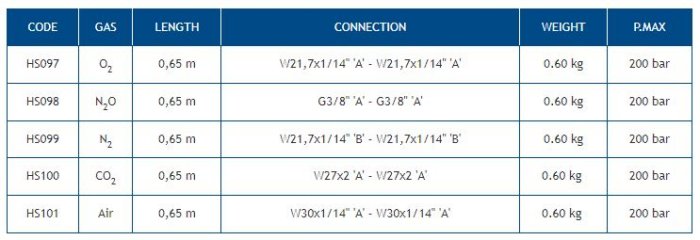 High pressure nickel-plated copper pipe with external diameter Ø 10 mm, internal diameter Ø 5 mm, linear length 650 mm. Brass inlet and outlet connectors with specific threading and seal according to the gas.