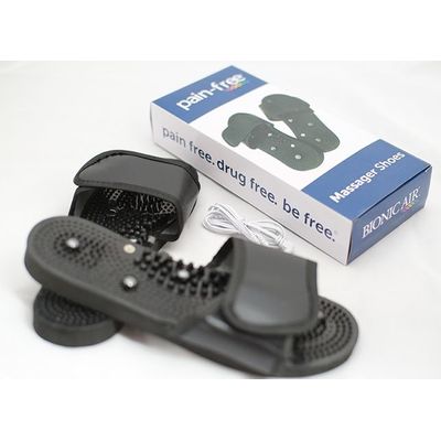 Reflex areas on the feet are stimulated and, through nerve conduction, then stimulate and relax various parts of the body. Therefore promoting overall health and well being while providing a relaxing foot massage. The painPod Massage Shoes are to be used in conjunction with the pain free medical devices, which may also assist with increasing blood circulation, reducing swelling and reducing fluid retention.