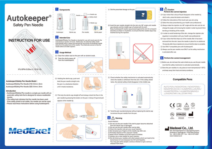 AutoKeeper is disposable needle using with insulin pen. AutoKeeper is safety pen needle which automatically locked itself after use. This product is to prevent re-use and secondary infection. The red part appears before use and disappear after use, so that user can distinguish if it is used or not easily.