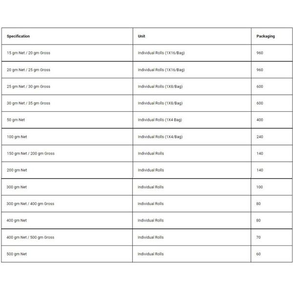 Packing: Sizes below 100 grams are available in blister packing. Specially designed attractive packing for Pharmacy stores and retail Chains. For all other sizes individual rolls are packed in polybags or paper wraps depending on buyer preference.