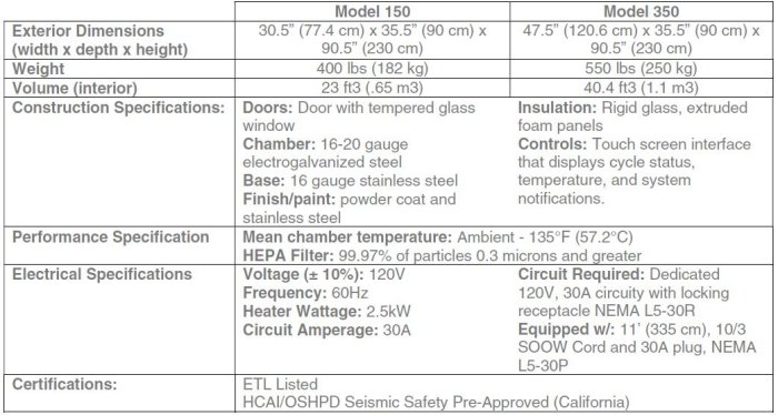 - Modular Stainless Shelves – 23-1/2” x 11”; Model 350 (45 shelves max.), Model 150 (16 shelves max). Max shelf weight is 40lbs.