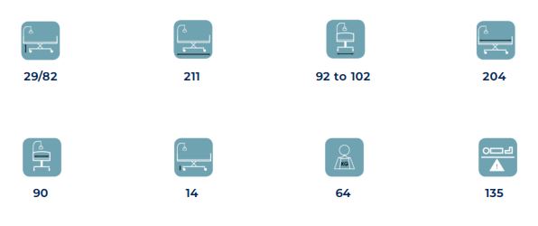 Modern with "S Mod" or "Main courante" end boards. Electric variable height from 29 to 82 cm. 2-part sleeping surface, mattress platform with Hi-Tech plastic slats for a better comfort (option: wooden slats). Electrical back rest. Manual leg section (Euro 1400 beds). Electrically operated leg section with knee-break (Euro 1402). Handset with key lockable. Epoxy coated metalwork in beige (RAL 1015) - other colours available. 2 lifting or IV pole supports. 4 castors Ø100 with brakes. Dismountable in 3 parts. Bed designed with an integrated trolley so easy to mount and dismount by one person.