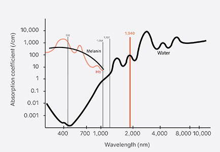 - Absorption coefficient of 1940nm is also higher than 1st~3st generation diode laser in the water. (808nm, 980nm, 1470nm)