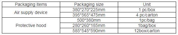 - Air supply device Continuous working time: greater than or equal to 4 hours.