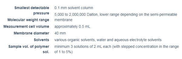A membrane osmometer consists of an osmotic cell which is located in a cell thermostat. The osmotic cell is divided into two sections by a semipermeable membrane.