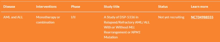 DSP-5336 is currently being investigated in a phase I/II study in adult acute leukemia patients with and without MLL rearrangement or NPM1 mutation.