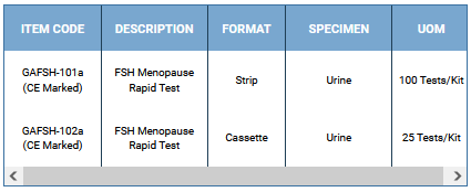 The FSH Menopause Rapid Test is a rapid lateral flow chromatographic immunoassay for the qualitative detection of Follicle-Stimulating Hormone (FSH) at the sensitivity of 25 mIU/mL in urine to evaluate the onset of menopause in women. The test utilizes a combination of antibodies including a monoclonal anti-FSH antibody to selectively detect elevated levels of FSH. At the level of claimed sensitivity, the FSH menopause test shows no cross-reactivity interference from the structurally related glycoprotein hormones hCG, hLH and hTSH at high physiological levels.