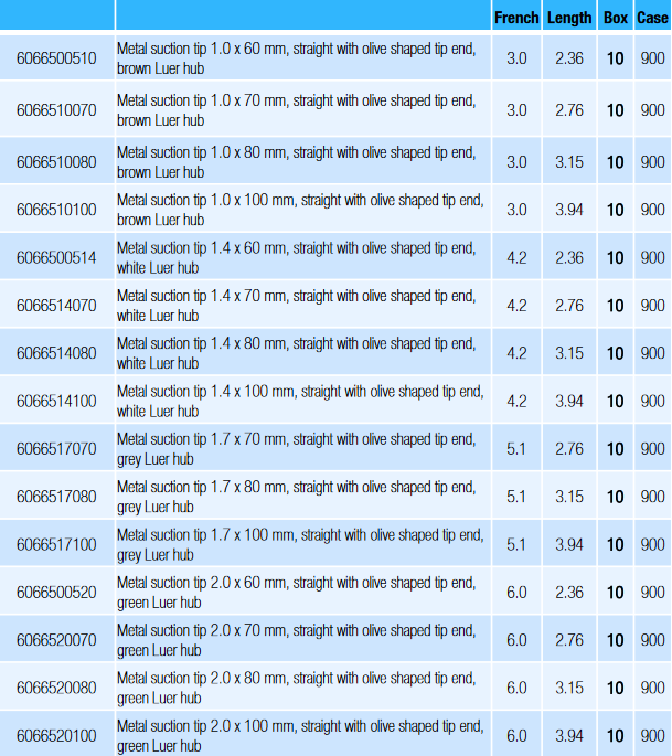 These straight suction tips available with luer lock connection and soft olive shaped tip assure safe, secure and non-traumatic suctioning when close to the dura by sphenoidal surgery or mastoid cavity surgery, among other uses. Available in the following lengths and diameters.