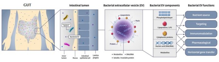 Postbiotics, also known as metabiotics, biogenics, or simply metabolites, refer to soluble factors and EVs secreted by live microbes or released after microbial lysis, and they provide physiological benefits to the host. Postbiotics are a newly emerging modality in therapy. Cell-to-cell communication is tightly regulated, and its disruption contributes to disease development. Intercellular communication can occur either via cell-to-cell contact or via soluble factors. Soluble factors include proteins and small molecules that bind specific receptors on target cells, which then trigger a signaling cascade that will affect the cell phenotype. However, more recently, another process also involved in this type of communication has been highlighted. In addition to producing specific factors, microbial cells can send a package of information, called microbial EVs, that is enclosed by a cell membrane. Moreover, recent scientific evidence has shown that certain microbial EVs have protective effects against disease development or progression.