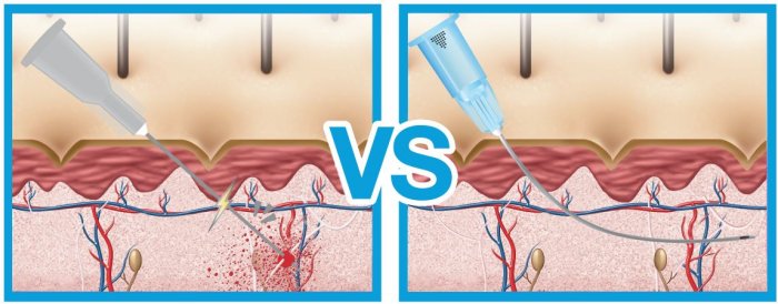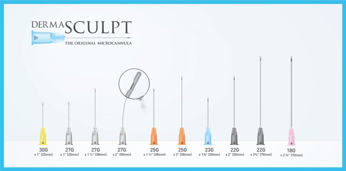 Flexible Cannula: Flexible cannulas for superficial & stiffer cannulas for deep injections. Blunt tip: Dermasculpt`s blunt tips slide under the skin without causing any trauma. Hub marking: Know the direction of the opening at all times. More control, more precision, better results.