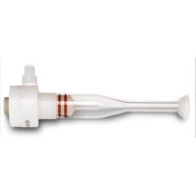 Low-Volume, Total Consumption Spray Chamber: Samples may be self-aspirated to the DS-5 or pumped via a micro-HPLC pump; nebulizer gas is supplied to the DS-5 from the host ICP-MS instrument. The DS-5 can be inserted directly into the included low-volume (8 mL) spray chamber which can attach directly via a 12/5 glass socket to the base of the ICP-MS torch. This arrangement enables rapid sample stabilization and washout times and maintains chromatographic peak resolution. Note that the DS-5 is a total consumption nebulizer system, as no liquid waste accumulates in the spray chamber at such low flows.