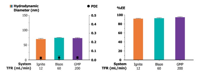 Particle size, polydispersity and RNA encapsulation efficiency are consistent as production of epo-encoded mRNA-LNP was scaled using the NanoAssemblr® platform.