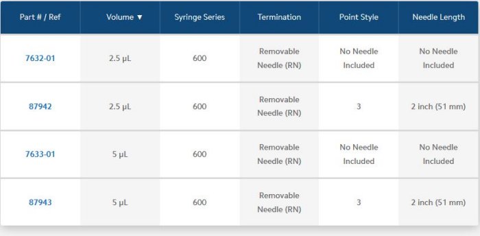 The 600 series syringes are a half stroke version of the original 700 series syringes. This series of syringes is ideal for dispensing volumes from 0.25 μL up to 5 μL. The 600 series is often used in applications that require one handed operation because of the short stroke length and the reinforced plunger.