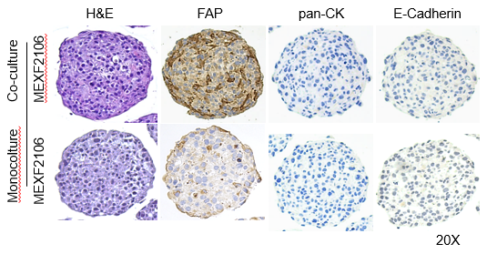 3D InSight™ Tumor Microtissue from Melanoma PDX IHC markers: pan-CK and E-Cadherin (epithelial cells), FAP (fibroblasts). PDX cell suspension from MEXF 2106 generated spheroids either with (top, co-culture panel) or without additional fibroblasts (bottom, monoculture panel). Co-cultures show an heterogenous distribution of fibroblasts and melanoma tumor cells within the entire cell structure.
