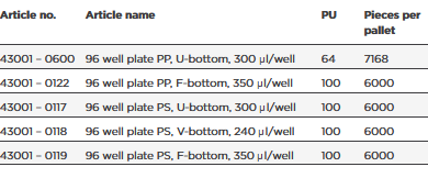 Riplate 96 plates out of highly transparent polystyrene assure an optimal surface for microscopic analysis. The standardized dimensions (128 x 85 mm) ensure the compatibility with most common laboratory machines. Riplate® 96 is available in different shapes (U-, V- and F-shape) and can be provided in bioclean® version upon request. Due to the alphanumeric coding, samples can be clearly assigned and identified.