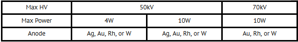 - Ag, Rh, Au, or W Target (Ag not available in 70kV)
