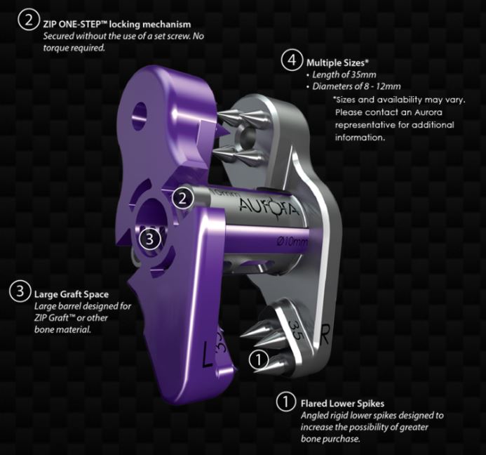 The ZIP 51™ is Aurora Spine`s minimally invasive interlaminar fixation implant for spinal fusion and was developed as an alternative to pedicle screw fixation. The ZIP 51 implant is designed for stabilization and load sharing during T1 - S1 thoracolumbar fusion procedures, specifically for the treatment of degenerative disc disease, lumbar spinal stenosis, spondylolisthesis, trauma, and/or tumor. The proprietary ZIP ONE-STEP™ locking mechanism eliminates the use of a set screw. Each ZIP 51 implant features a large barrel designed for ZIP Graft™ or other bone material. The ZIP 51 is designed in various sizes to accommodate variations in patient anatomy. The flared lower spikes are designed to increase the possibility of greater bone purchase.
