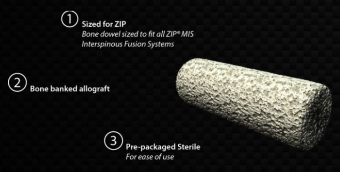 ZIP Graft is a cancellous allograft designed specifically for use with the ZIP® MIS Interlaminar Fusion Systems within the US. It is freeze-dried with a five-year shelf life. ZIP Graft is gamma-irradiated and packaged sterile for immediate use. All tissue and blood samples are tested for infectious diseases by CLIA Certified Labs. All of the testing and processing of donated tissue meets or exceeds all American Association of Tissue Banks (AATB) standards and FDA regulations. All allografts are terminally sterilized via low dose gamma irradiation with a Sterility Assurance Level (SAL) of 10-6. Available for US distribution only.