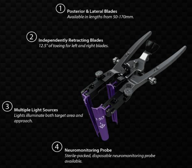 The Compass 4D™ MIS Retractor system is designed to aid in exposure, retraction, decompression, and disc preparation of the spine. Compatible with all products used in Aurora`s Screwless Procedure, the Compass 4D provides optimal access while minimizing tissue damage. Crafted out of titanium, the Compass 4D features three independently moving blades, with an optional fourth blade. Blades are available in various lengths to accommodate patient anatomy and approach. Multiple lights are available to increase the visualization during procedures; one to illuminate the approach, and a disposable, sterile-packed light to illuminate the target area. A disposable, sterile-packed optional probe is also available to use with the neuromonitoring system of choice.