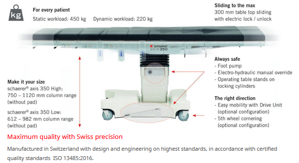 The Schaerer AXIS 350 is combining Swiss precision with longevity which leads to cost efficiency. Through its unique design, the operating table offers high versatility for all surgical applications. This electro-hydraulic OT-table has two different columns, a sliding table top, Log-file on SD-card for service purpose, 450kg/992lbs weight capacity, stand on stamps and has as options Bluetooth wireless hand control, Motor drive and a 5th wheel.