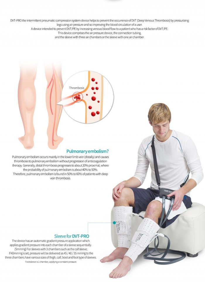 DVT-PRO the intermittent pneumatic compression system device helps to prevent the occurrence of DVT (Deep Venous Thrombosis) by pressurizing legs using air pressure and so improving the blood circulation of a user. A device intended to prevent CVT/PE by increasing venous blood flow to a patient who has a risk factor of DVT/PE. This device composes the air pressure device, the connection tubing and the sleeve with three air chambers or the sleeve with one air chamber.