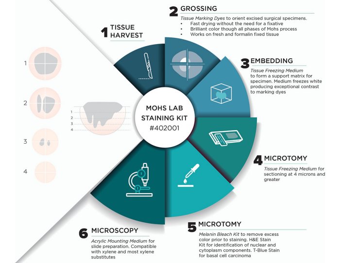 Tissue staining is the cornerstone of Mohs Micrographic Surgery (MMS). EDM3s new “all inclusive” Mohs Lab Staining Kit, will consistently yield slides with the highest quality, excellent morphology and differentiation of target cellular components. The kit includes marking dyes, freezing medium, bleaching reagents, both Hematoxylin and Eosin (H&E) and Toluidine Blue (T-blue) stains as well as mounting medium.