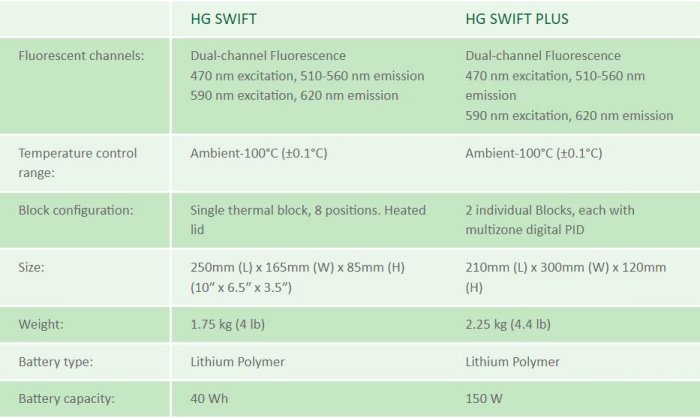 - Simultaneous detection across 8 (HG Swift) or 16 (HG Swift PLUS) in 2 fluorescent channels