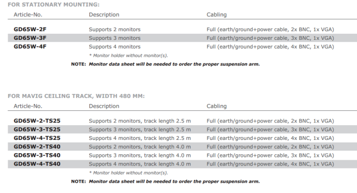 IntegriTech distributes and installs the GD65 - a sophisticated MAVIG suspension for two to four monitors, designed for easy, friction free operation. In case of collisions during use, the Cardanic joint of the GD65 smoothly repositions itself with no damage to the people or instruments. The modular system allows the installation of additional monitors, infrared receivers, and other accessories.